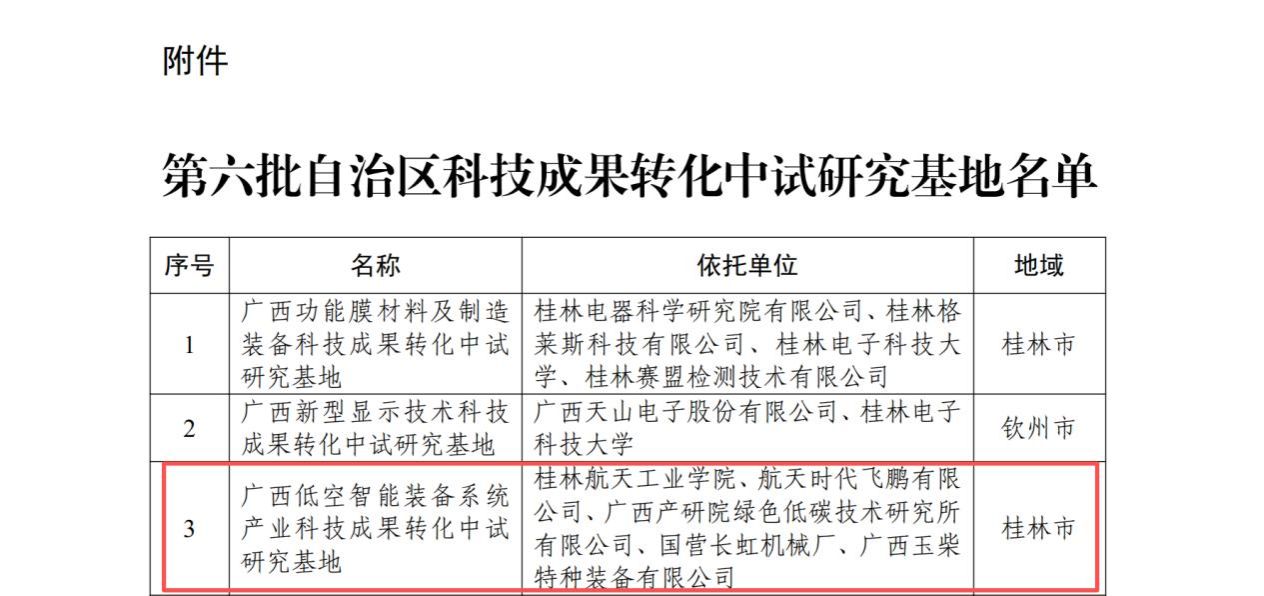 近日,广西壮族自治区科学技术厅正式公布了第六批自治区科技成果转化中试研究基地名单(桂科发〔2025〕413号)。由我校牵头,联合航天时代飞鹏有限公司、广西产研院绿色低碳技术研究所有限公司、国营长虹机械厂、广西玉柴特种装备有限公司共同申报的“广西低空智能装备系统产业科技成果转化中试研究基地”成功获批!这是我校获批的首个中试研究基地,也是广西第一个低空智能装备领域的自治区级中试研究基地,标志着我校在航空航天特色科研成果转化平台建设方面取得了新突破。