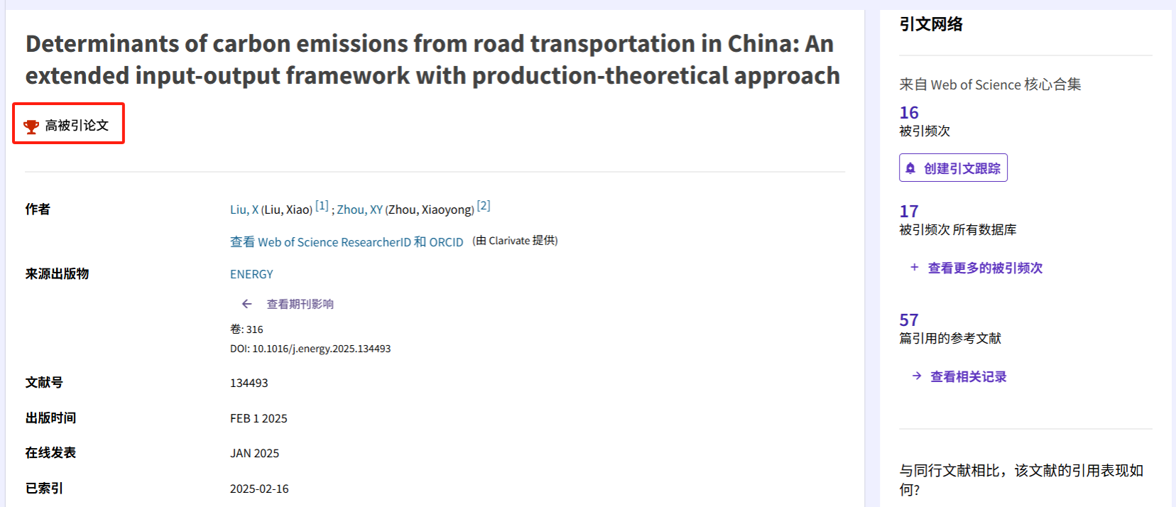 近日,我校数字碳中和创新团队周小勇教授于2025年发表的2篇SCI/SSCI论文同时入选Clarivate Analytics(科睿唯安)ESI高被引论文(全球前1%),标志着我校在该学科领域的成果具有一定国际学术影响力,引起了国际同行广泛关注,对于提升我校国际声誉将起到促进作用,对扩大我校学科影响力具有重要意义。