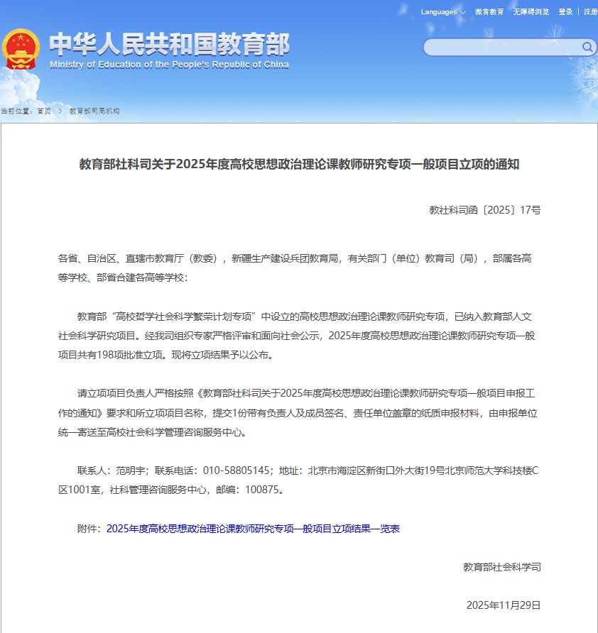 近日,教育部社科司发布了2025年度高校思想政治理论课教师研究专项一般项目立项通知,我校马克思主义学院教师谢斯玮申报的《基于“五个高度认同”的新时代民族地区高校思政课教学改革研究》获批立项。据悉,本次教育部高校思想政治理论课教师研究专项一般项目全国共有198项批准立项。此次立项,是学校深入落实立德树人根本任务,积极推动思政课建设内涵式发展的重要体现。