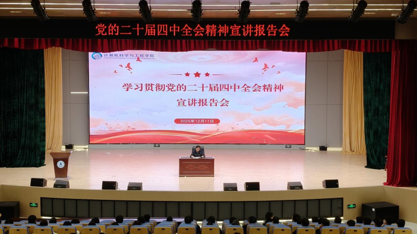 为深入学习贯彻党的二十届四中全会精神,引导师生准确把握其重大意义与核心要义,12月11日,计算机科学与工程学院在图书馆报告厅召开党的二十届四中全会精神学习宣讲会。学院党委书记杨小劲作专题宣讲,学院2022级及2023级全体学生和教师代表参加。