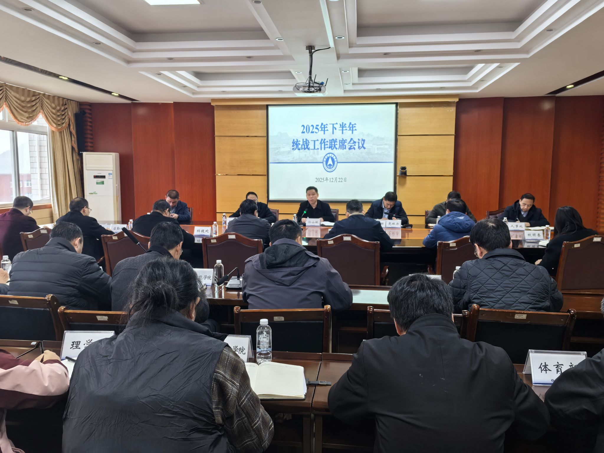 12月22日下午,学校在飞天楼517会议室召开2025年下半年统战工作联席会议。校党委副书记孙山林出席会议并讲话。学校统战工作领导小组成员单位、各二级党组织负责同志参加会议。会议由党委统战部主要负责人主持。