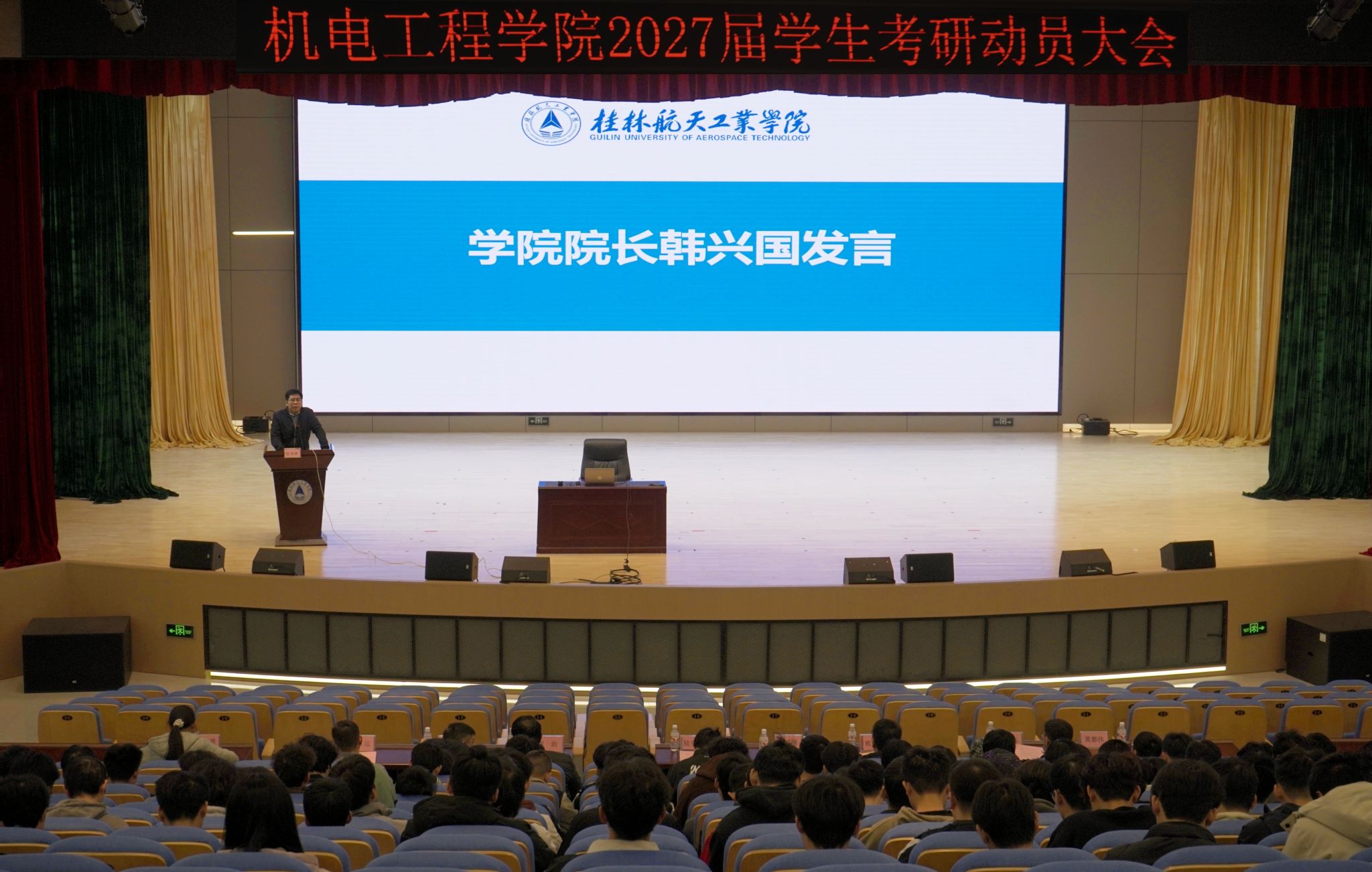 为持续深化学风建设,全面激发学生学习内生动力和考研热情,12月30日中午,机电工程学院在问天楼学术报告厅召开2027届学生考研动员大会。学院院长韩兴国、党委副书记陆宇川、副院长熊中刚出席大会,各专业教师代表、2023级全体辅导员及500余名学生参会。会议特邀考取桂林电子科技大学研究生校友李亚萌、刘德清重返母校,为学弟学妹们分享考研备考的实战经验与心路历程。大会由陆宇川主持。