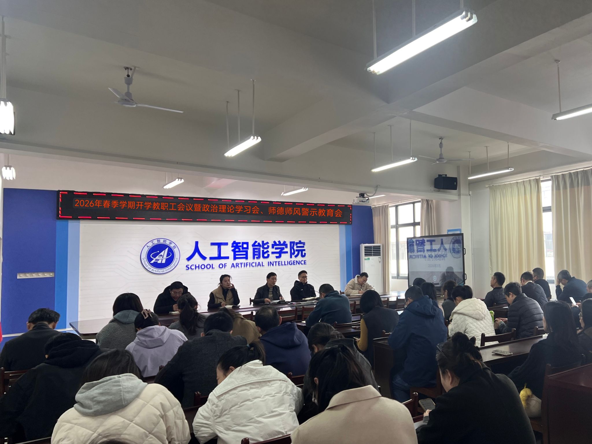 3月6日上午,人工智能学院在启天A505会议室召开2026年春季学期开学教职工大会暨政治理论学习会、师德师风警示教育会。学院党政领导班子成员、全体教职工参加会议。会议传达学习了习近平总书记近期系列重要讲话、重要指示批示精神和自治区党委、政府2026年新春第一会精神,以及全国、全区教育工作会议精神的部署要求。