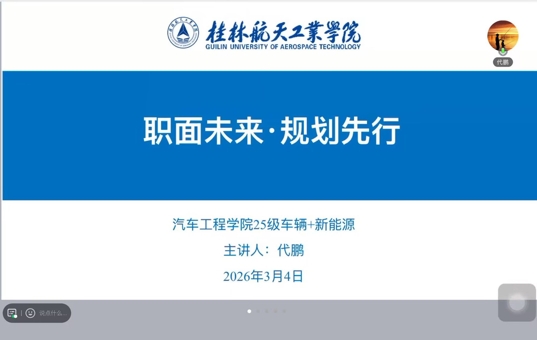 为帮助大一学生尽早树立职业规划意识,明确专业发展方向,把握行业脉搏,3月4日,汽车工程学院特邀校外导师代鹏(广西车猫汽车科技有限公司总经理),通过线上会议平台召开了一场就业交流指导会。全体辅导员及25级车辆工程专业和新能源汽车工程专业学生参加了会议。