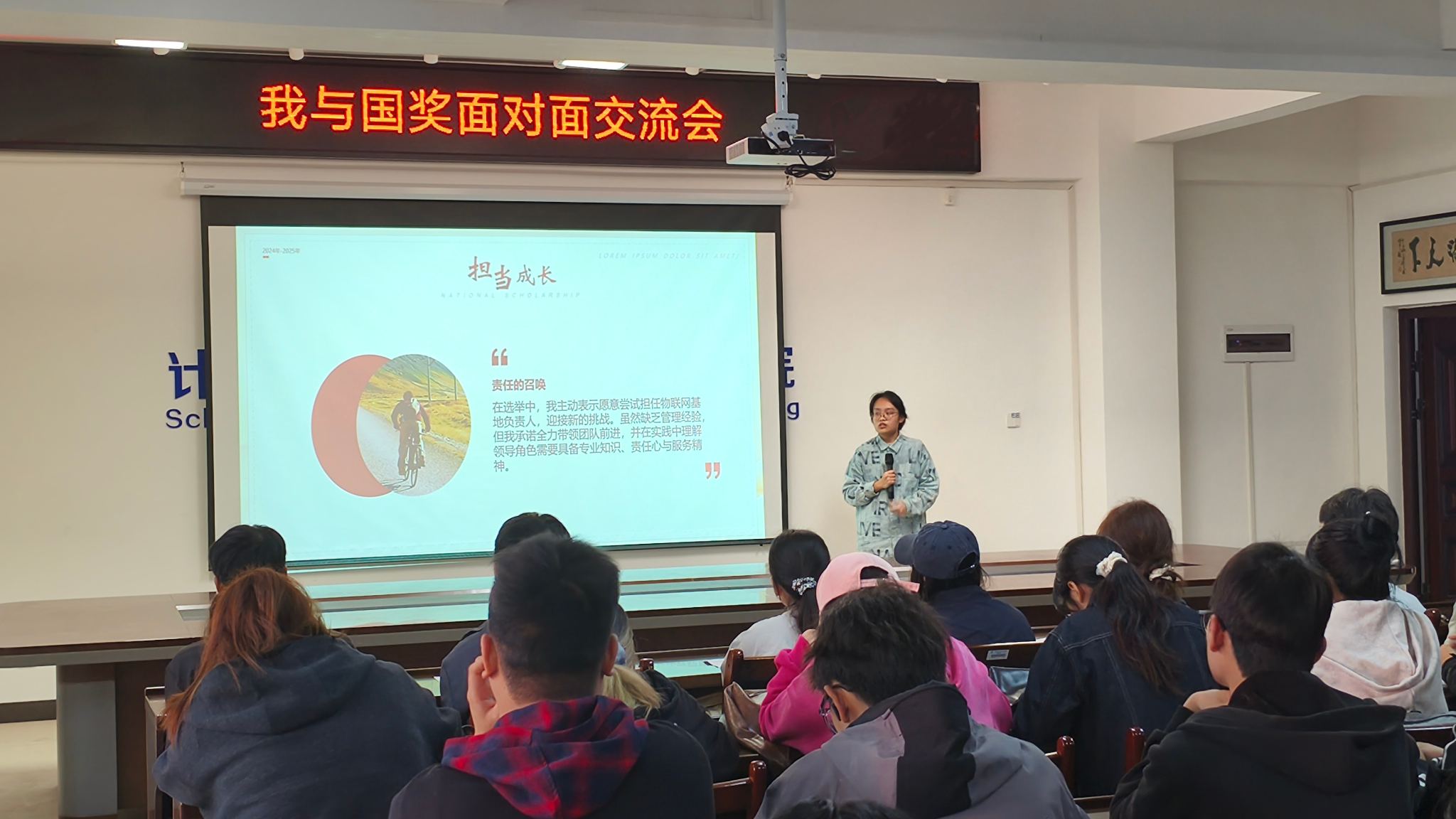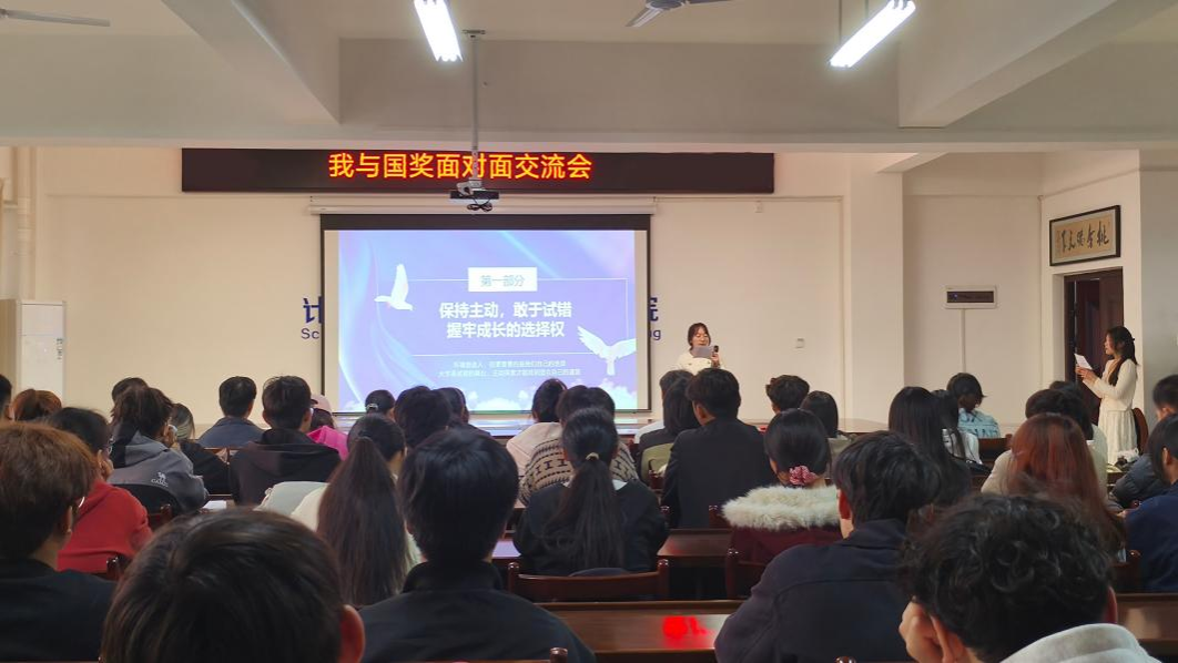 在“我与国奖面对面”交流会上,国奖获奖者分享了各自的成长历程。韦钰娟以“敢开始就会有收获”的经历,让大家看到厚积薄发、从确立小目标到突破自我的路径;任馨懿以“主动试错、坚持深耕、锚定目标”分享规划大学生活的新视角;刘永昌则围绕“深耕不辍 方得荣光”,讲述了自己从社恐到担任班干、成为入党积极分子、参加学科竞赛的成长故事。现场同学认真聆听,从这些鲜活的榜样故事中体会到,优秀源于日复一日的坚持与努力。