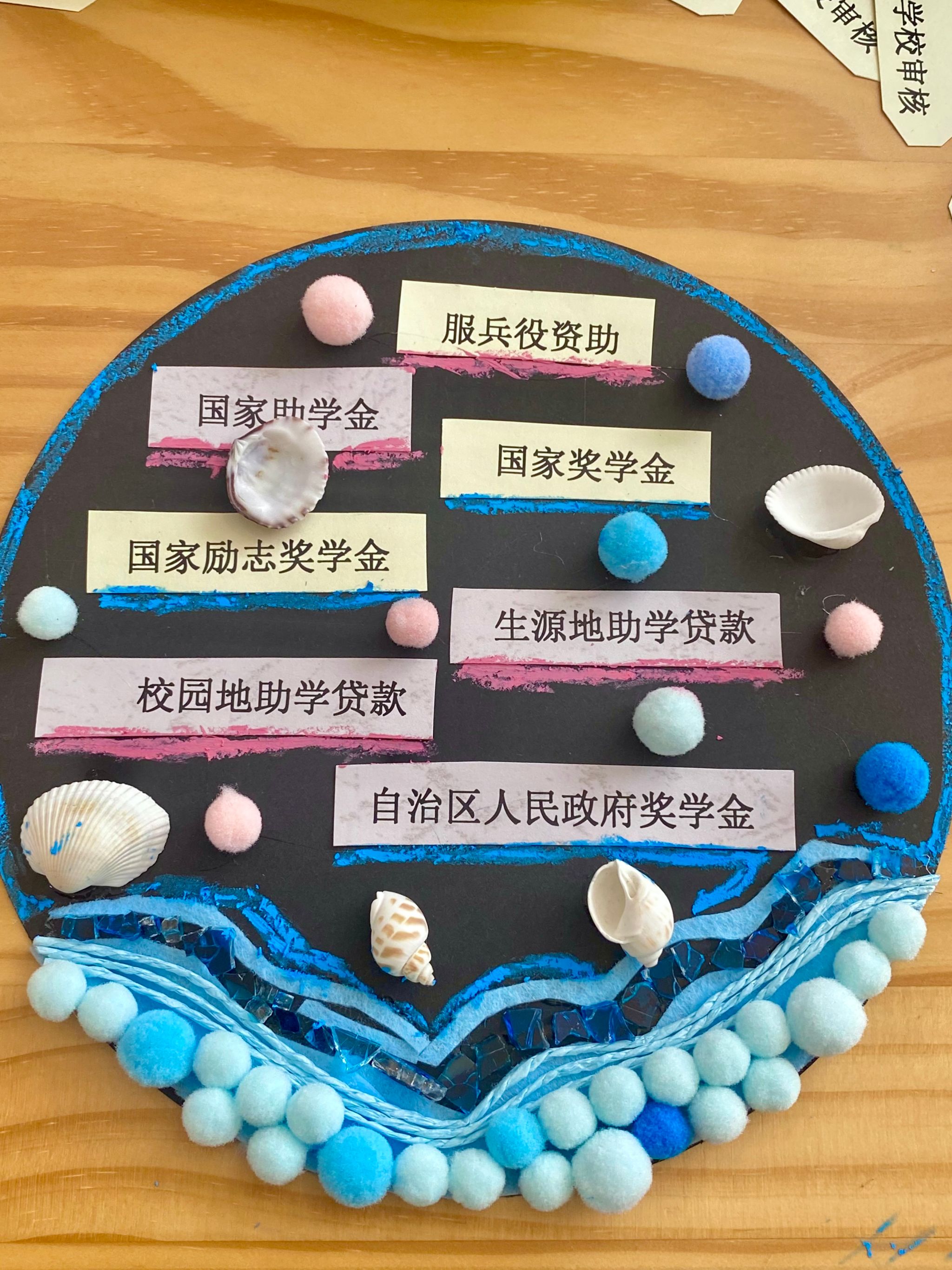 培训结束后,“趣玩学资助”欢乐体验营活动正式拉开帷幕,趣味资助答题围绕奖、助、勤、贷等核心政策,让学生在答题闯关过程中,轻松掌握资助金额、申请流程等实用知识,现场氛围热烈有序。拼贴画创作则为学生提供了卡纸、画笔、干花、词条等物料,鼓励学生将资助政策关键词融入创意创作,亲手制作资助拼贴画。活动中,学生们发挥奇思妙想,将“国家助学金”“勤工助学”等关键词与创意设计结合,创作了“梦想启航”“感恩之心”“未来可期”等众多新颖有趣、主题鲜明的作品,在动手实践中深化了对资助政策的理解。一幅幅充满创意和温情的拼贴画,不仅展现了同学们的艺术才华,更传递了大家对资助政策的深刻理解和感恩之情。