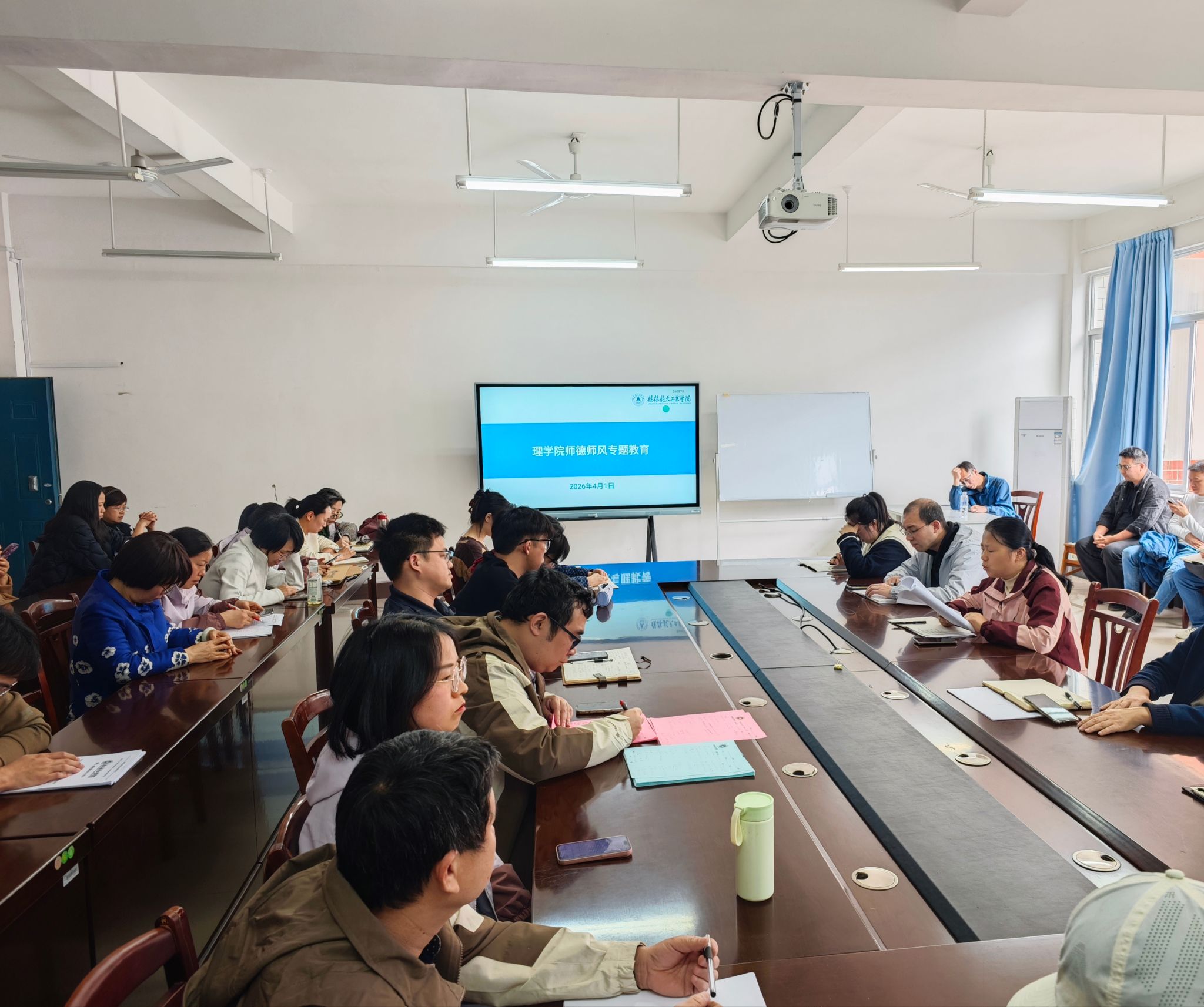 为进一步规范教师职业行为,筑牢师德底线。4月1日下午,理学院在巡天楼404会议室召开“铸师魂 守初心”师德师风专题教育会议。学院党委书记担任主讲,全体教师参加学习。