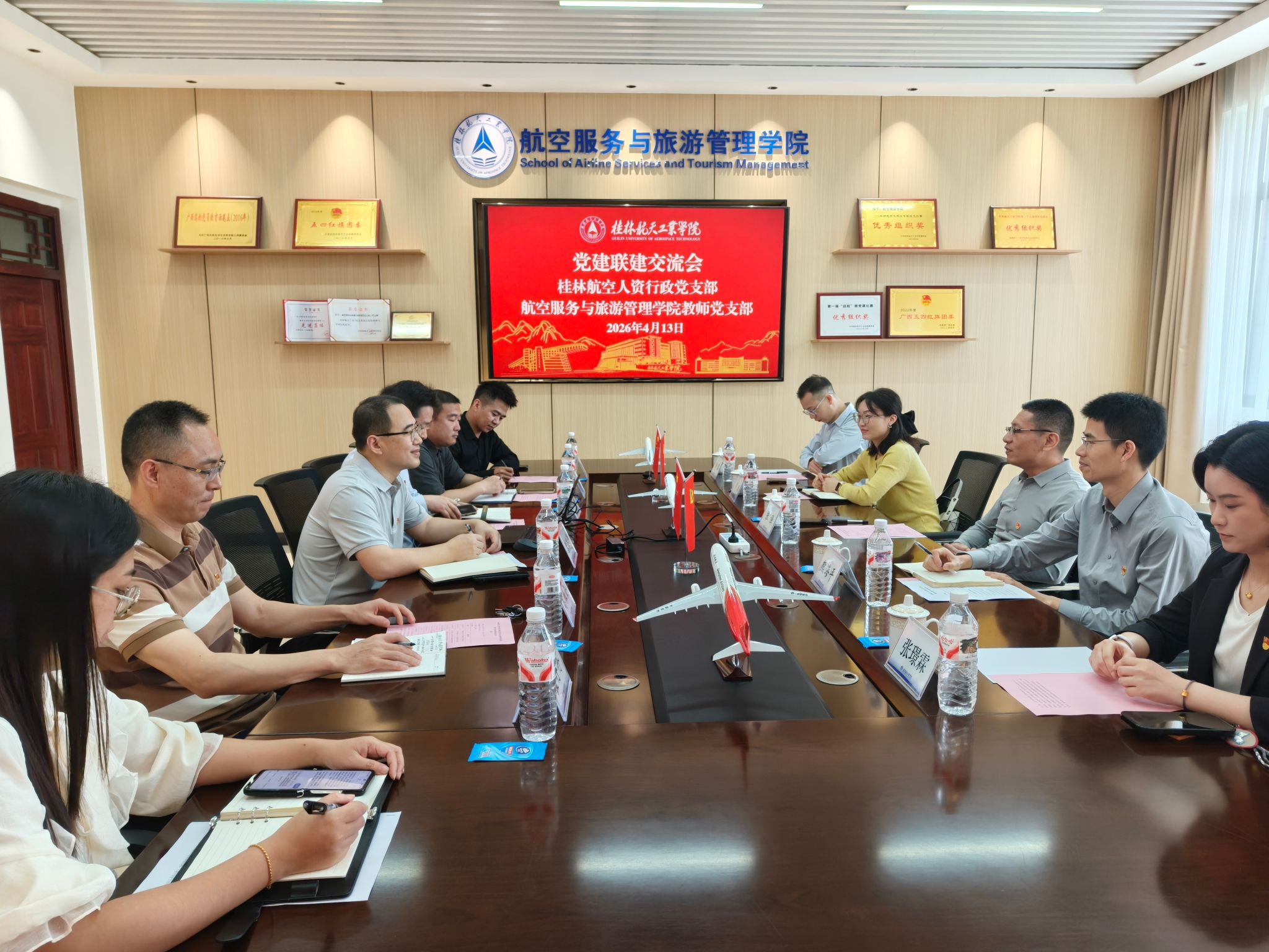 4月13日,航空服务与旅游管理学院与桂林航空有限公司联合举办党建工作经验交流会。桂林航空人资行政党支部书记张强及支委一行到访,学院党委负责人、教师党支部书记及党员代表参加。与会人员实地参观了学院党建文化展示区,集中观看“五星领航”党建品牌建设视频,全方位感受学院党建引领事业发展的浓厚氛围。