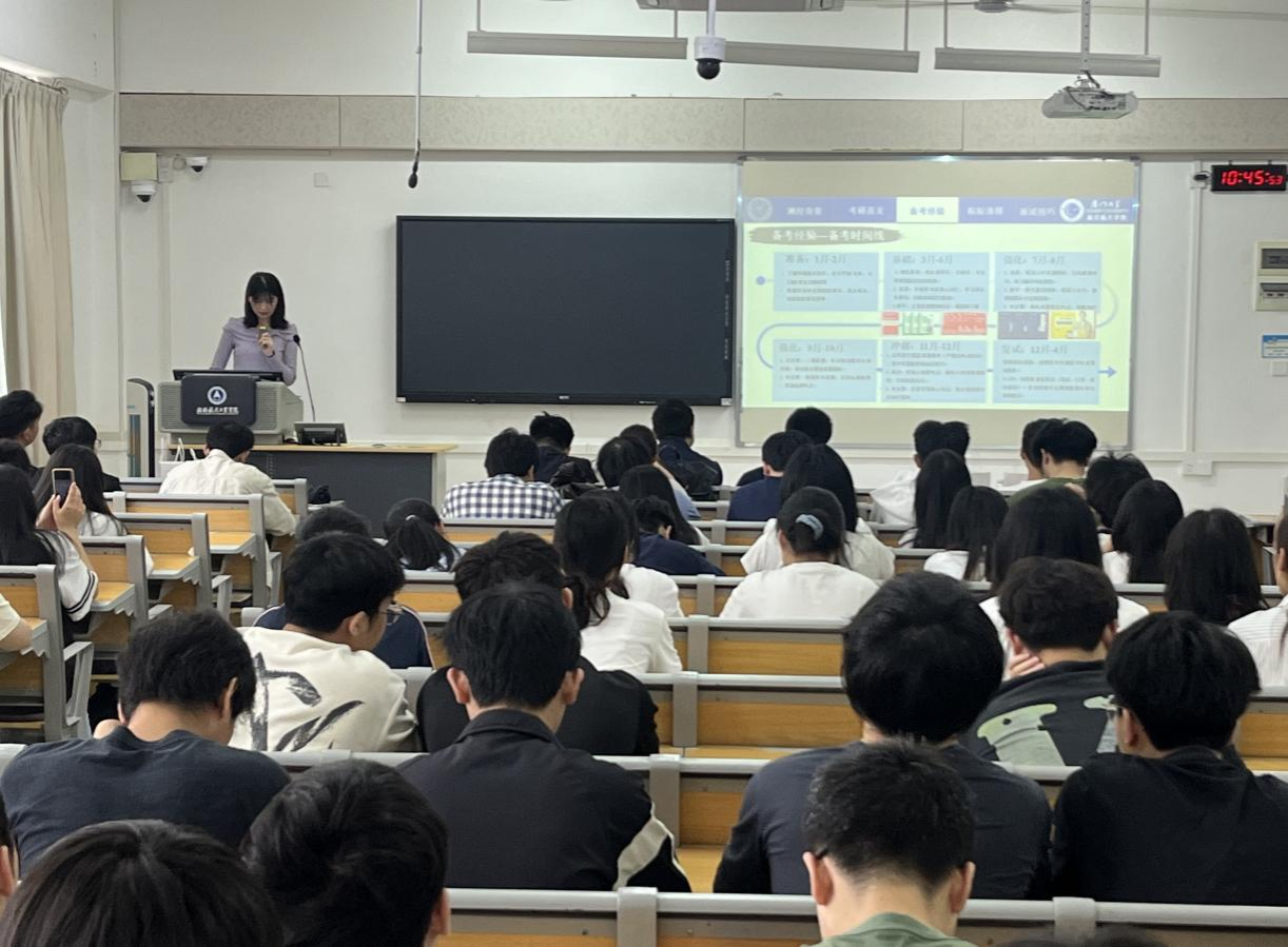 在考研分享环节,两位在读博士校友化身“备考引路人”,结合自身备考经历,细致拆解复习重点与院校选择策略,并分享了实用的复习方法、心态调整技巧及复试礼仪。他们提醒学弟学妹结合自身实力理性择校,主动获取招生资讯,鼓励大家坚定信念、脚踏实地,用科学方法少走弯路。每一句叮嘱都饱含关怀,为备考学子送上温暖指引。