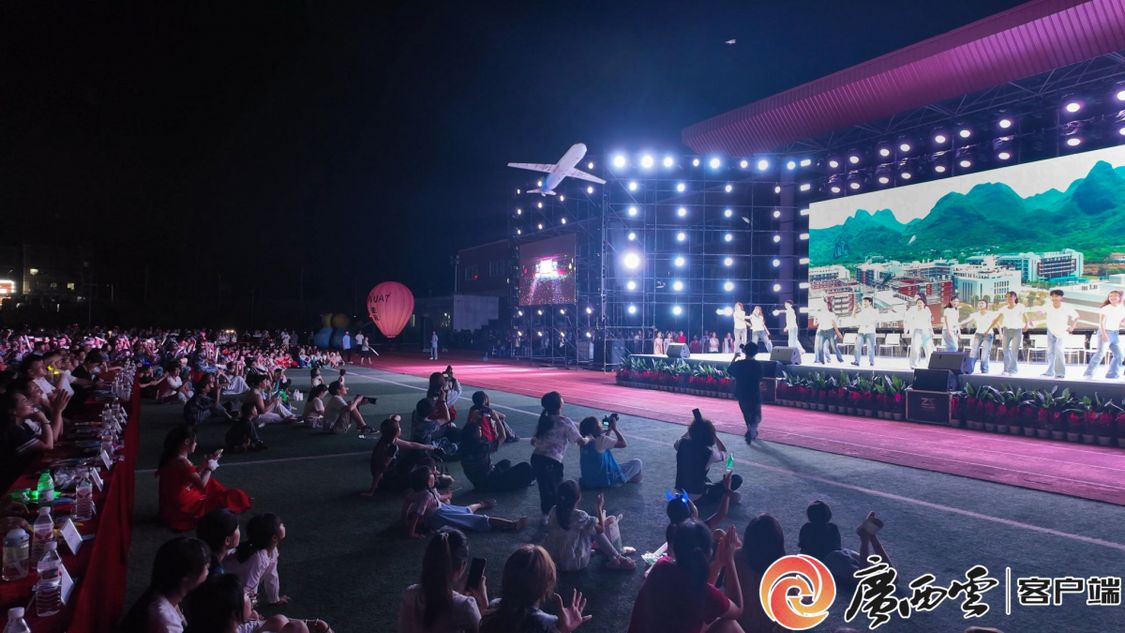 同心放歌,礼赞伟大时代。晚会在大合唱中迎来最高潮。当《蝴蝶泉边》的悠扬旋律响起,数架蝴蝶扑翼机在夜空中翩然起舞;而当《我爱你中国》的歌声响起时,全场师生纷纷点亮手机手电筒,万千光点汇聚成一片摇曳的星海。就在这动人时刻,一架凤凰航空模型腾空而起,与地上的“星海”遥相呼应,在夜空中划出绚丽的轨迹。全体师生用最真挚的歌声,向祖国献上最深情的告白。