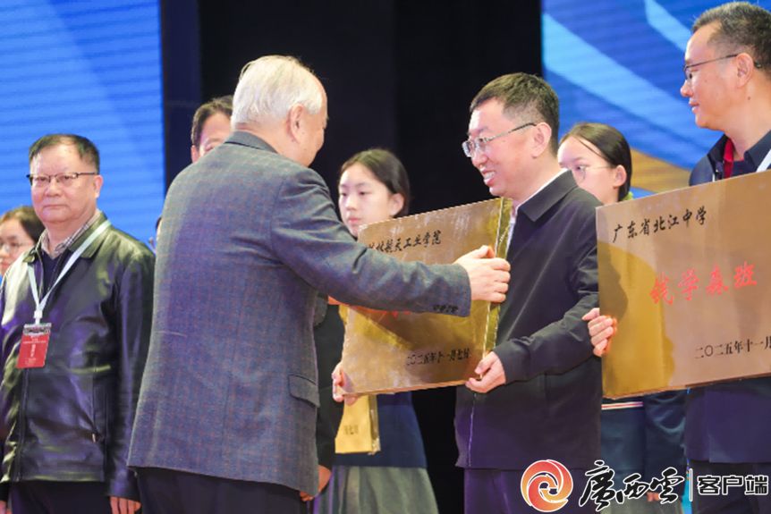 钱学森教育工作委员会主任委员、钱学森先生之子钱永刚教授向桂林航天工业学院颁发“钱学森班”班牌。陈欢 摄