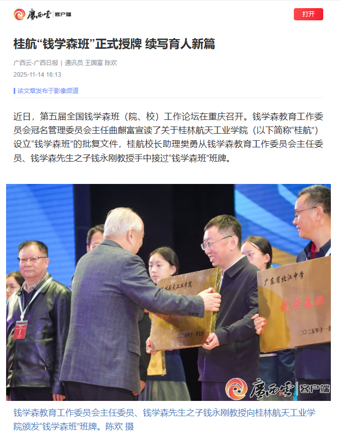 桂林航天工业学院的“钱学森班”正遵循钱学森“集大成得智慧”的教育理念,依托学校学科优势及航天行业资源,致力于培养工科基础宽厚、发展潜力大、综合素质高、创新能力强的高端航天人才。通过参与返回式卫星设计实践、航空马拉松赛事等活动,学生们在实践中全方位锻造综合素质,为航天强国事业积蓄青春力量。这不仅是对钱学森先生教育思想的最好传承,更是对“为谁培养人、培养什么人、怎样培养人”这一根本问题的深刻回答。我们有理由相信,从这里走出的每一位学子,都将怀揣着“航天梦、强国梦”,在未来的星辰大海征途中,为服务国家航天强国战略、实现中华民族伟大复兴的中国梦,贡献出源源不断的“桂航力量”。