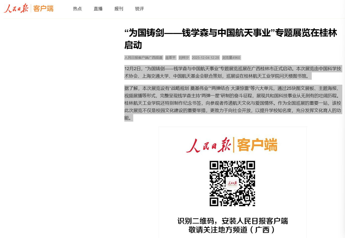12月2日,“为国铸剑——钱学森与中国航天事业”专题展览巡展在广西桂林市正式启动。本次展览由中国科学技术协会、上海交通大学、中国航天基金会联合策划,巡展设在桂林航天工业学院问天楼图书馆。