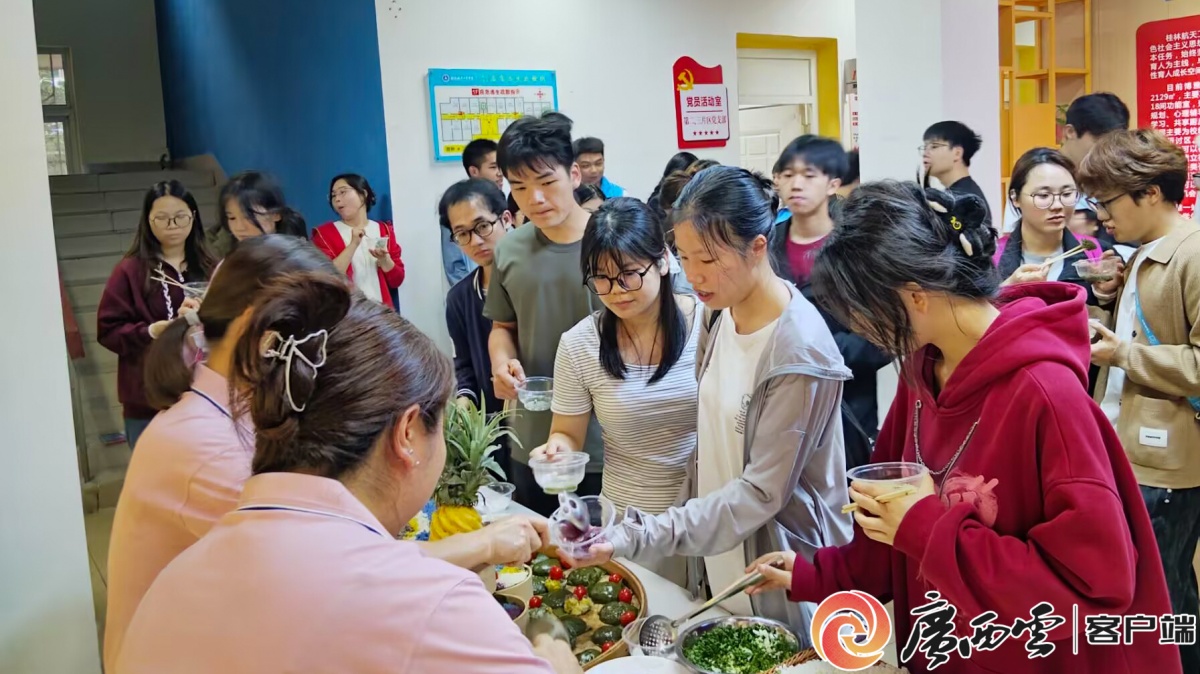 桂林市七星区融媒体中心为学生讲解拍摄思路 王亚东 摄 校内的“广西三月三·桂航嘉年华”同样精彩纷呈。主会场上,民族歌舞拉开了全校活动的序幕,师生们包粽子,尝粑粑,还有来自桂林市民族团结进步示范村、学校定点帮扶村——灌阳县玉溪村的非遗油茶技艺传承人连续三年走进校园,现场展示文市茱萸茶与灌阳油茶的制作技艺。