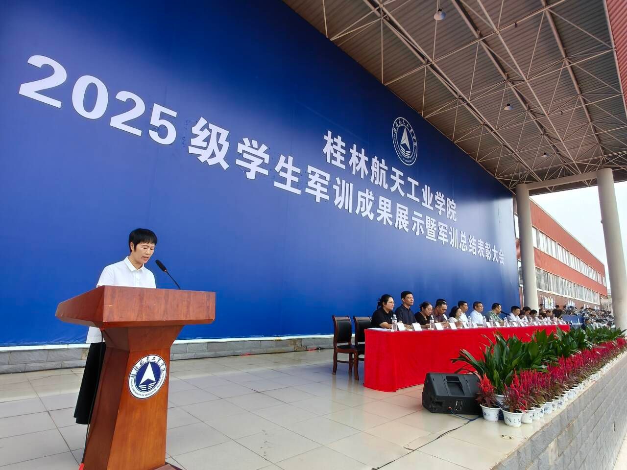 吴江萍副书记作军训总结讲话,她代表学校向付出辛勤汗水的全体教官和各部门单位工作人员表达了衷心的感谢,向圆满完成军训任务的2025级同学们表示亲切的慰问,向获誉的先进集体及个人表示热烈的祝贺。同时,她寄语2025级学生:一是以阅兵为镜,从精神传承中筑牢信仰根基;二是以军训为基,从航天精神中锤炼优良作风;三是以青春为笔,在大学征程中书写成长答卷。她期望同学们把军训养成的纪律意识、团队精神,与航天人“严字当头、实字托底”的作风结合,把军训中收获的品质,作为未来逐梦的“精神燃料”,成长为有理想、有本领、有担当的新时代青年。