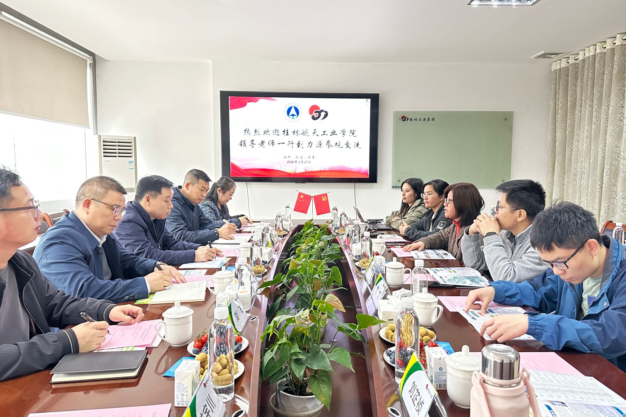在桂林力源粮油食品集团有限公司,一行参观智能仓储中心、旗舰门店、党建中心后,双方开展深入洽谈。孙山林高度赞扬企业“合作、创造、共赢”的文化理念,希望企业各事业部为我校学子提供更多优质岗位,从机械、电子等专业进一步拓展到营销、物流、商务类专业,进一步关注在岗校友成长成才,共同打造力源的“桂航品牌”。